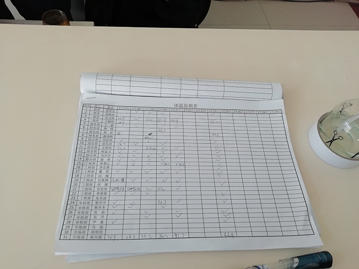 ??(六)各單位疫情管控人員需設(shè)立測溫點及臨時隔離室,配備防護口罩、消毒液等相關(guān)疫情防控用品。對出勤到崗職工執(zhí)行每日測量體溫、填寫《職工日體溫記錄表》制度,發(fā)現(xiàn)異常立即按規(guī)定處置、報告。